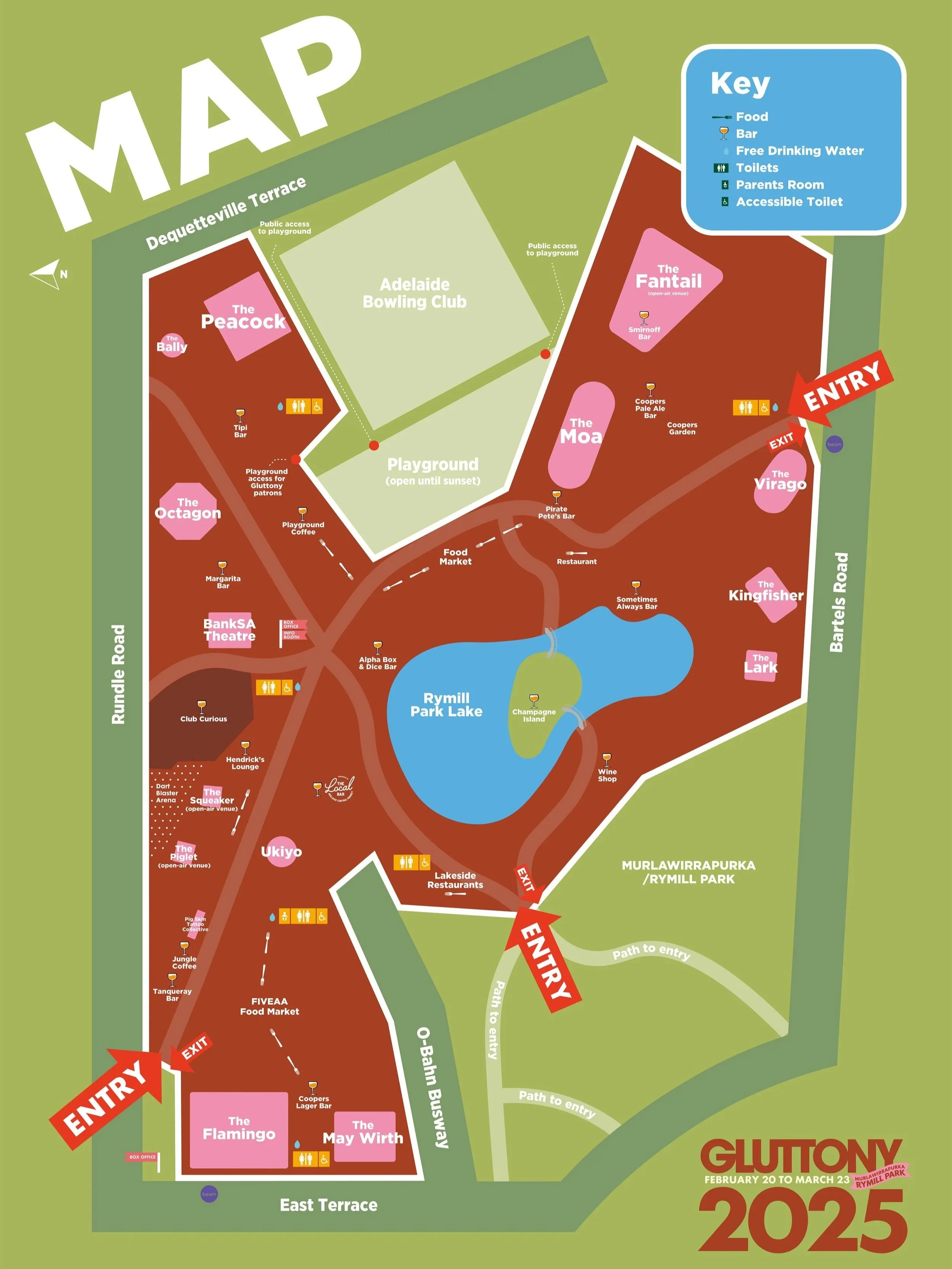 Working as Design Assistant for Gluttony at Adelaide Fringe, I created key deliverables including a detailed site map to help visitors navigate the sprawling parklands, as well as bold, easy-to-read menus for 12 themed bars. All designs were created to align with Gluttony’s energetic, playful brand identity, enhancing wayfinding, improving the visitor experience, and contributing to the overall visual cohesion of the event.