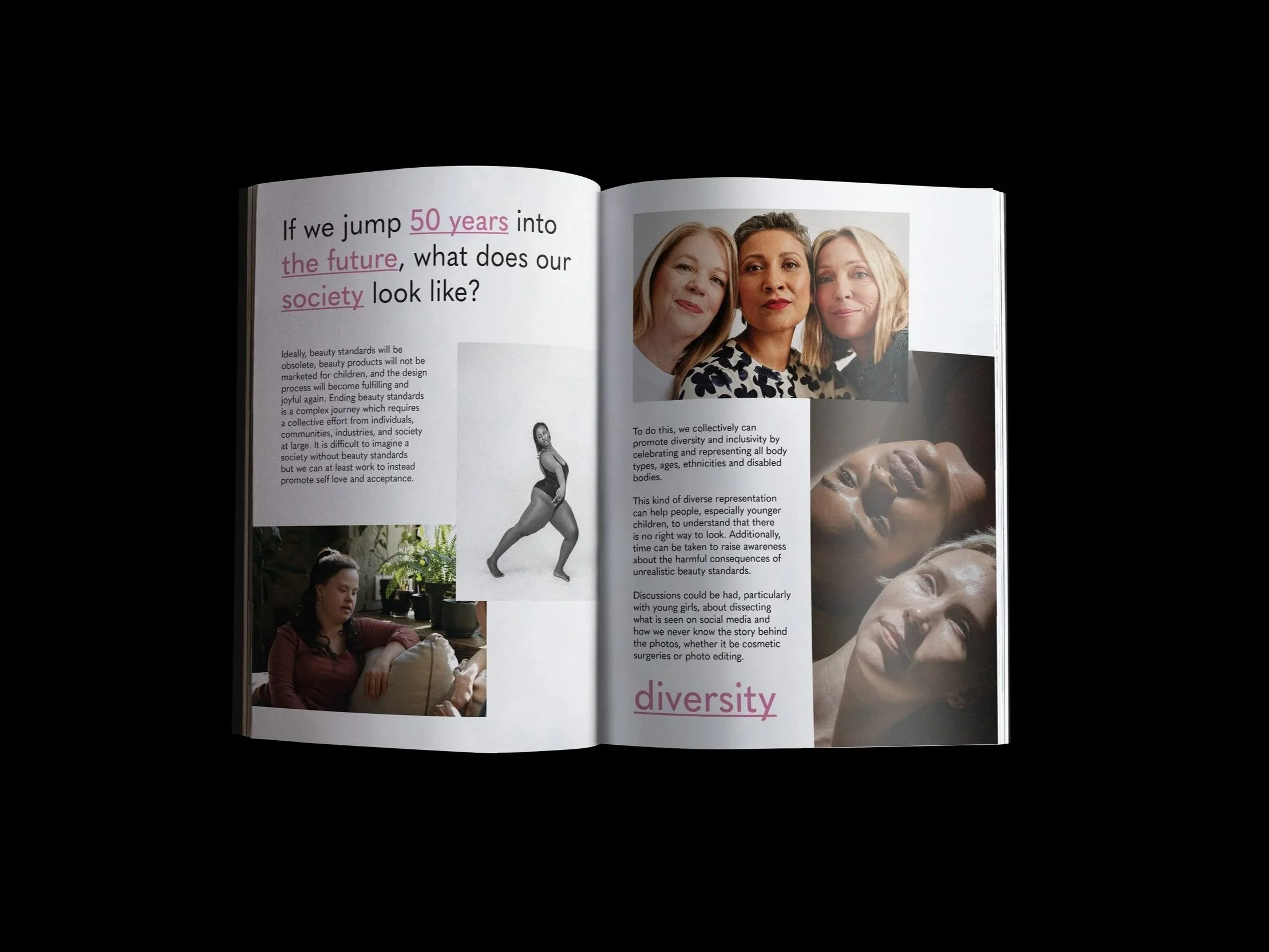 This editorial booklet explores the contradictions of modern beauty culture, critiquing the very standards it’s styled to reflect. Designed with flawless finishes, refined typography, and polished layouts, the format mimics high-end beauty publications while its content pulls focus on the pressures, filters, and impossible ideals within.